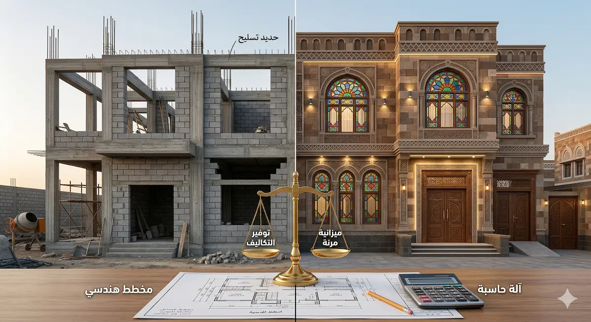- الميزة الأكبر: الشفافية المطلقة؛ أنت تعرف بالضبط أين يذهب كل ريال لأنك تشتري المواد بنفسك وتتابع أسعار البناء في اليمن يومياً.
